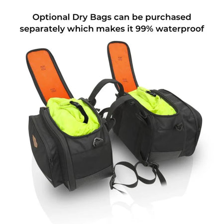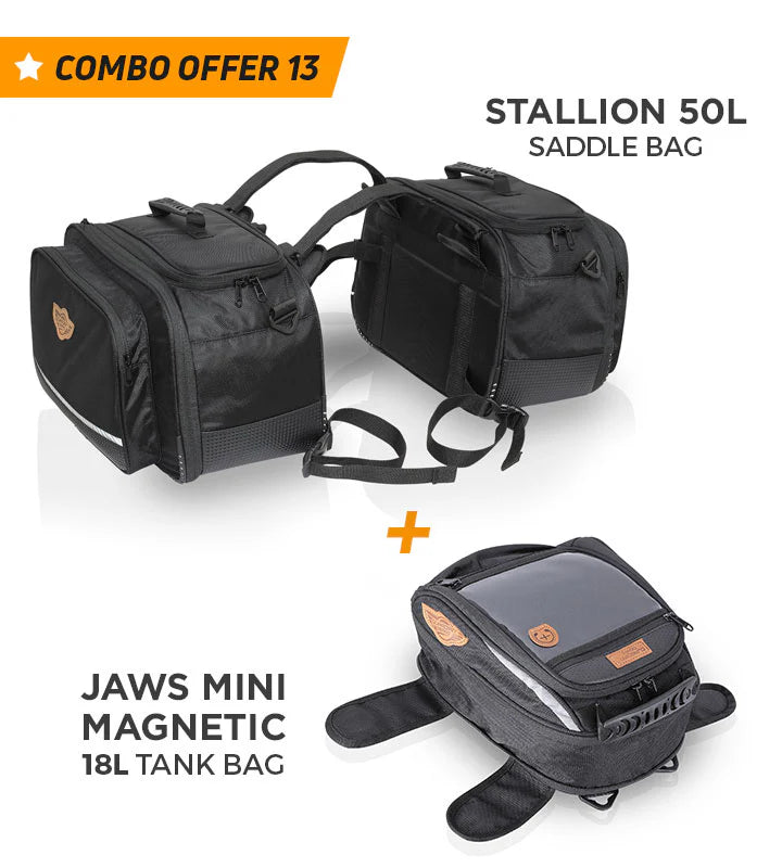 Combo 13: Stallion 65L Saddle Bags plus Jaws Mini Magnetic 18L Tank Bag with Waterproof Rain Covers Included