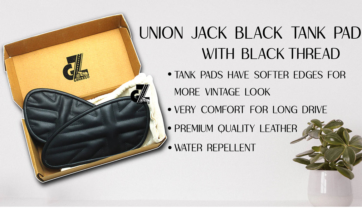 Leather Union Jack Black Tank Pad with Black Thread Genuine Leather for Royal Enfield Interceptor 650