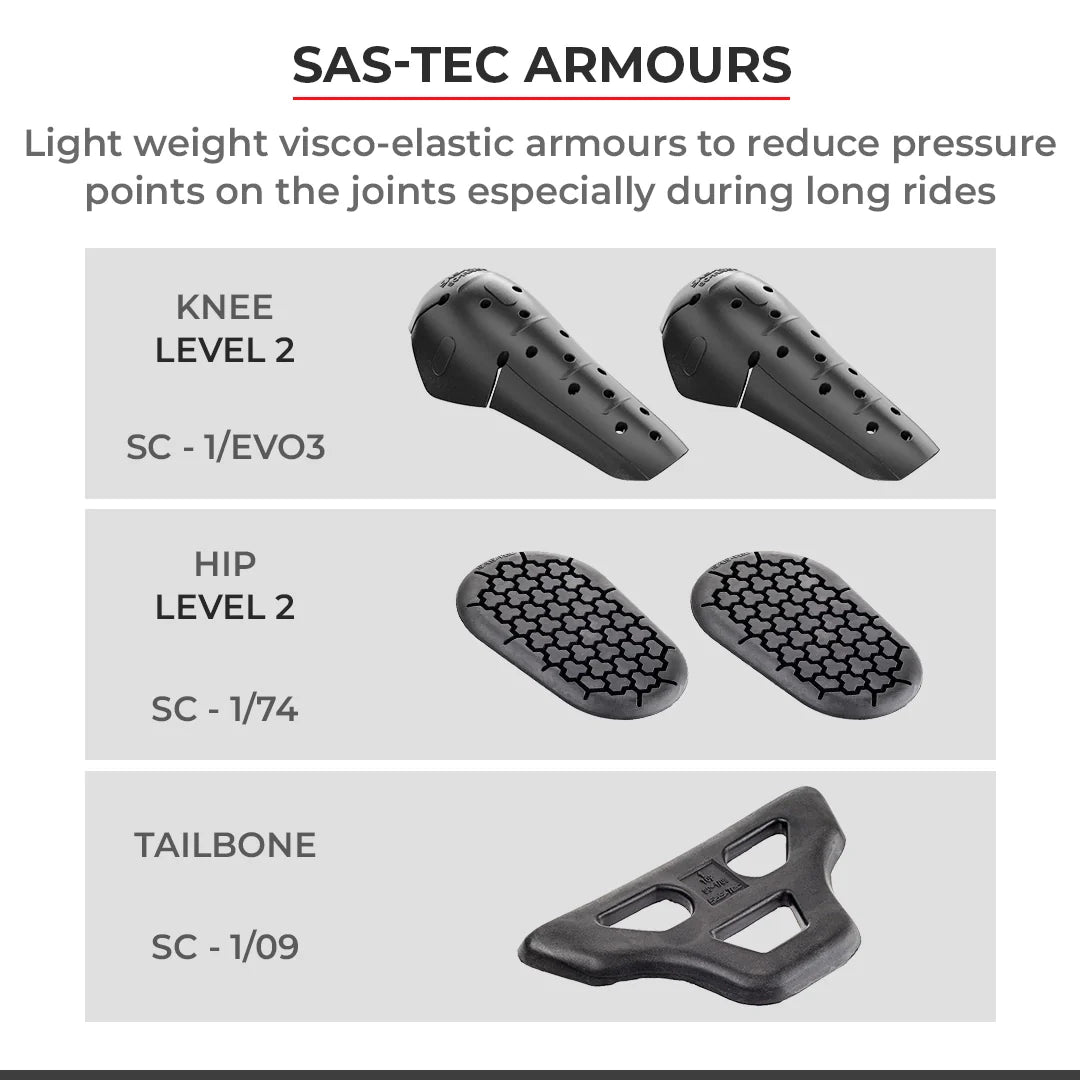 - SasTec CE Level 2 armours for superior lightweight protection - Sas-Tec armours are designed with special materials that harden on impact while absorbing the energy but remain light and flexible otherwise.
