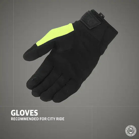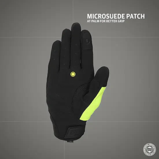 ROYAL ENFIELD URBAN HUSTLER V2 GLOVES - NEON GREEN Gear up for your next ride with the Urban Hustler V3 Riding Gloves. Crafted from 100% polyester air mesh, microsuede, and poly stretch fabric, these gloves offer the perfect blend of comfort, flexibility, and durability. The TPR knuckle protection ensures your hands are well-guarded, while the 3 mm rubber sponge padding in the palm provides extra cushioning and support. The microsuede grip patch, composed of 50% polyamide and 50% polyurethane, ensures a secure and comfortable hold on the handlebars. Ventilated air mesh material keeps your hands cool and dry, and the palm reinforcement with velcro offers a snug fit. RRGGLO230179 RRGGLO230187 RRGGLO230191