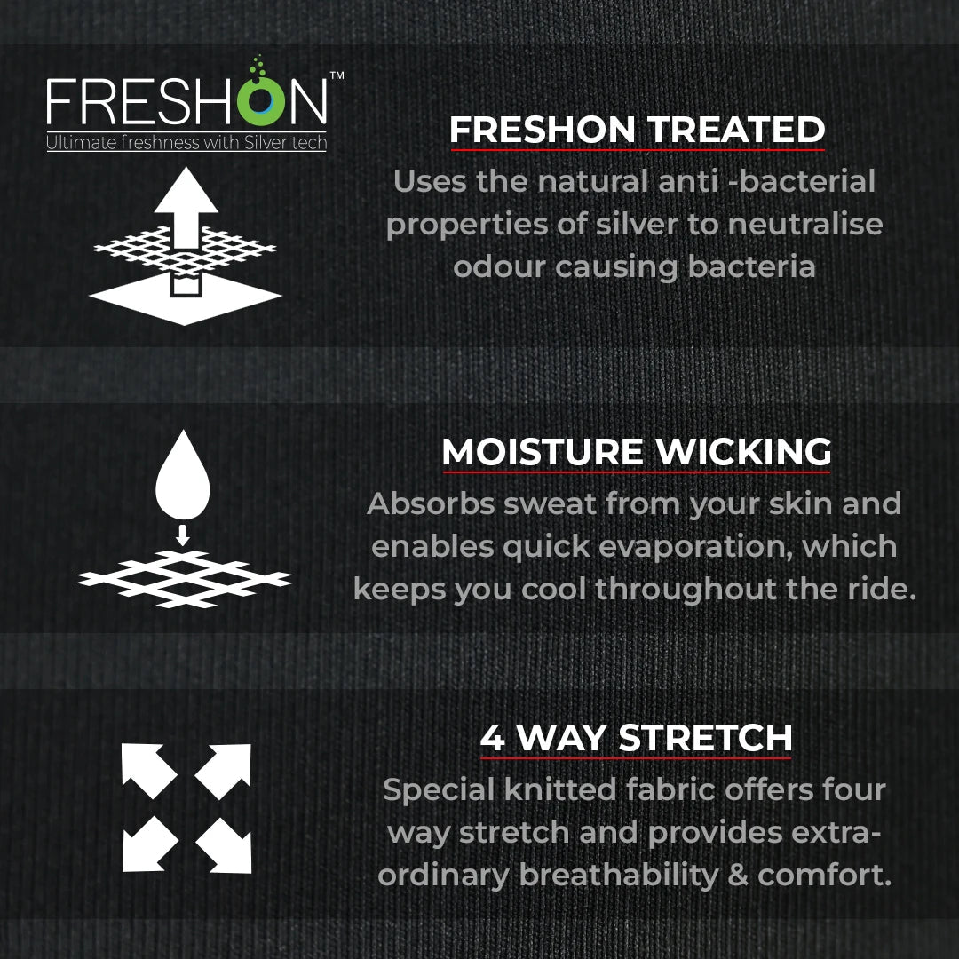 - Odor-eliminating treatment: Treated with FreshOnTM, that uses natural anti-bacterial properties of silver to neutralize odour causing bacteria. Ride with confidence, heat, or no heat!