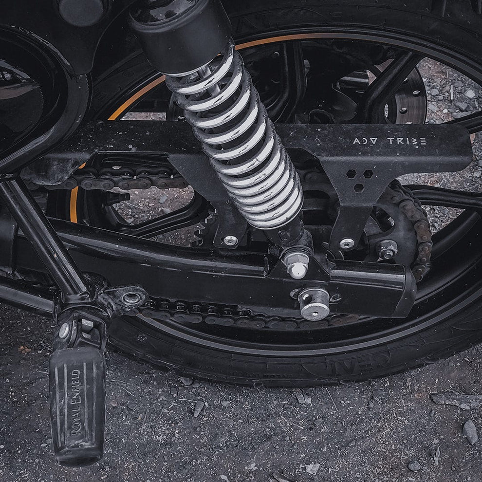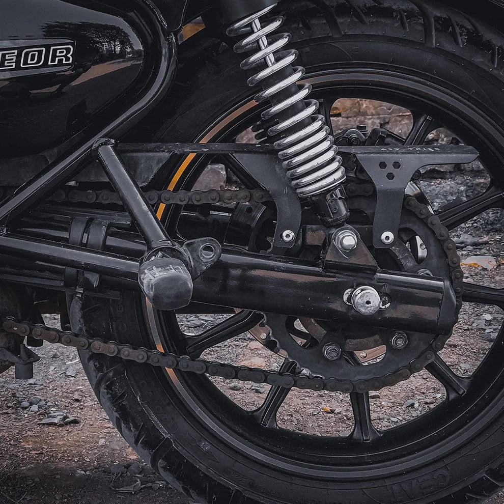 Replace the flimsy, plastic chain guard that came with your Royal Enfield Meteor 350 with our high-quality chain cover made of 3mm CNC laser-cut aluminum alloy and powder coated for a sleek look.