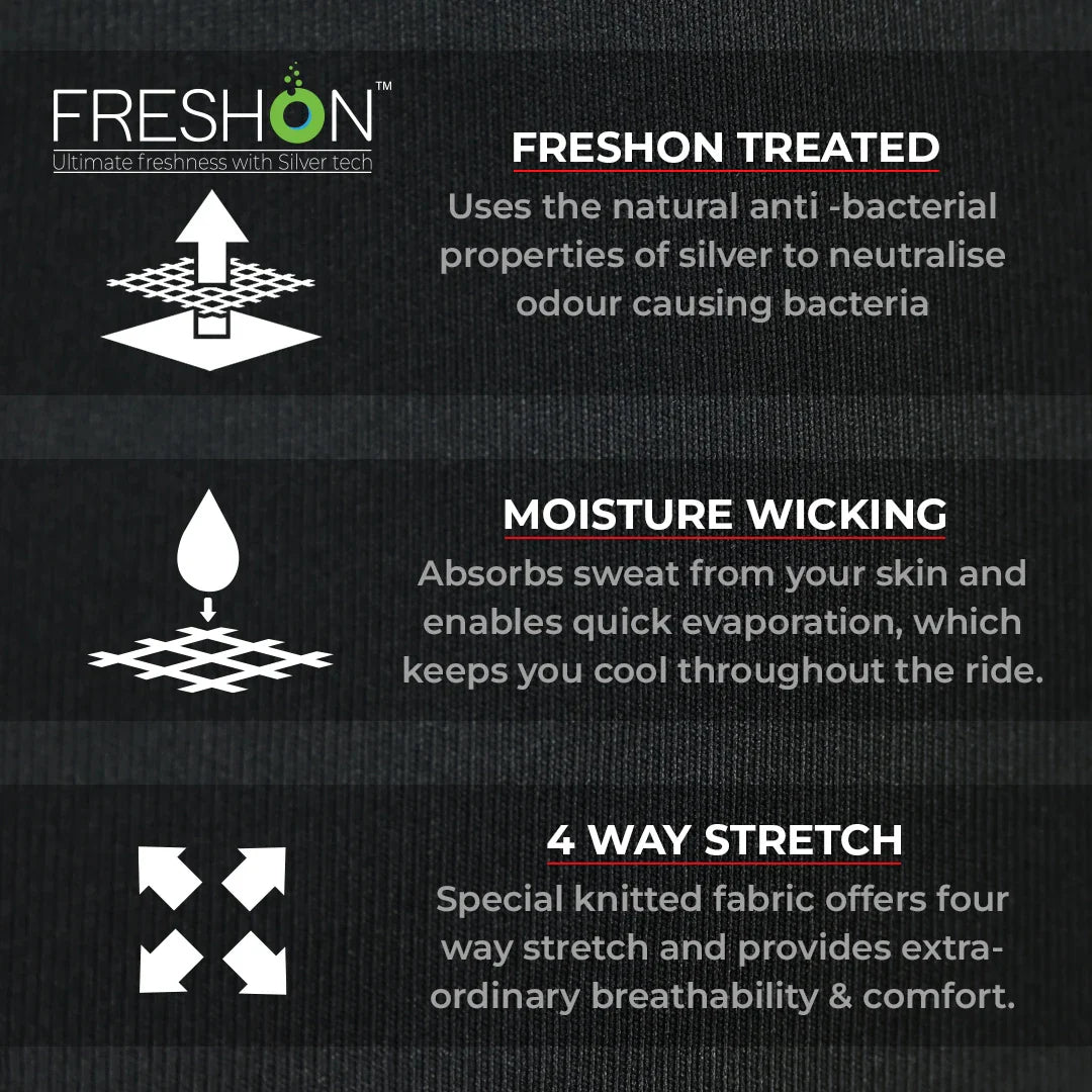 • Odor-eliminating treatment: Treated with FreshOnTM, that uses natural anti-bacterial properties of silver to neutralize odour causing bacteria. Ride with confidence, heat, or no heat!