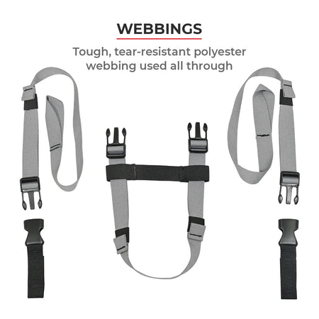 Webbing: Tough, tear-resistant polyester webbing used all through