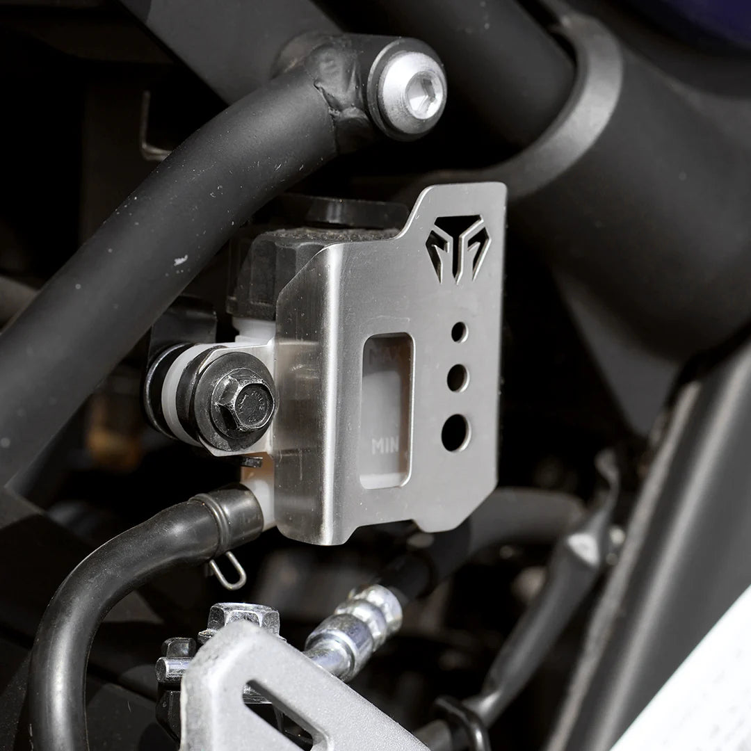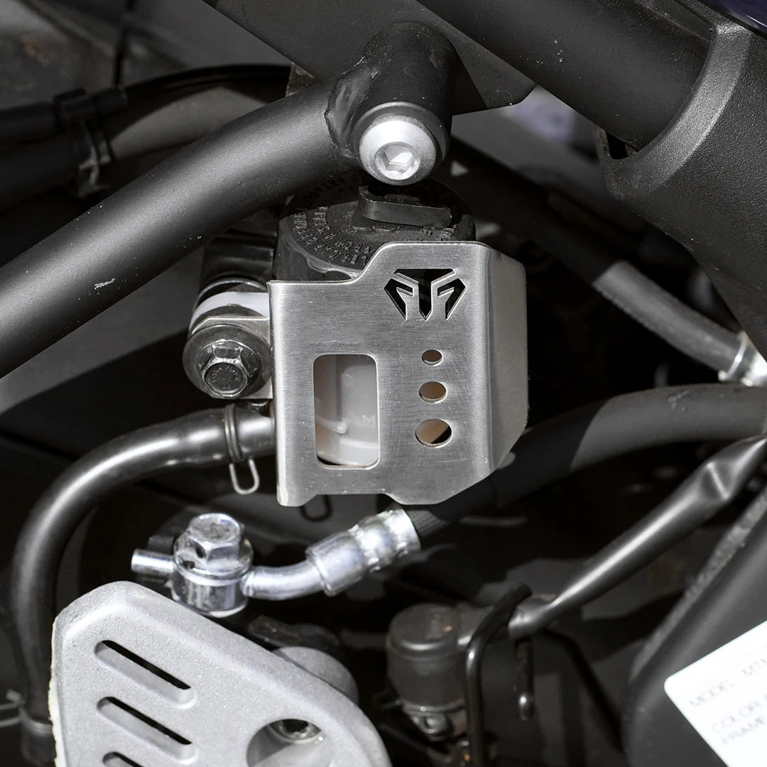 The Moto Torque Reservoir Oil Guard (SS) for the Yamaha XSR 155 is a protective accessory designed to safeguard the brake and clutch oil reservoirs from stones, debris, and accidental knocks during daily riding or adventurous trips. Made from high-quality stainless steel (SS), this guard delivers excellent corrosion resistance, strength, and long-lasting durability in varied road conditions. Its precision-engineered, bike-specific design ensures a secure and seamless fit over the reservoir without interfering with fluid inspection or cap access. The bolt-on installation uses existing mounting points, making fitting quick and straightforward. Finished in a clean, rugged look, this guard not only provides reliable protection but also enhances the front end’s visual appeal, blending functionality with style for riders who prioritize both performance and aesthetics.