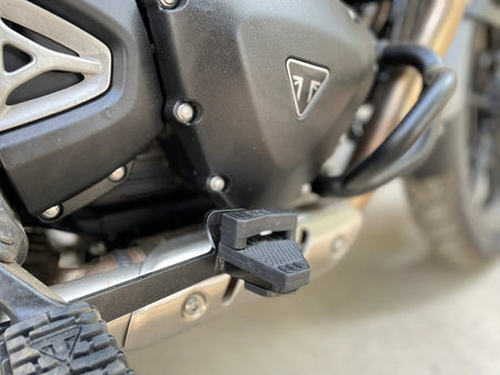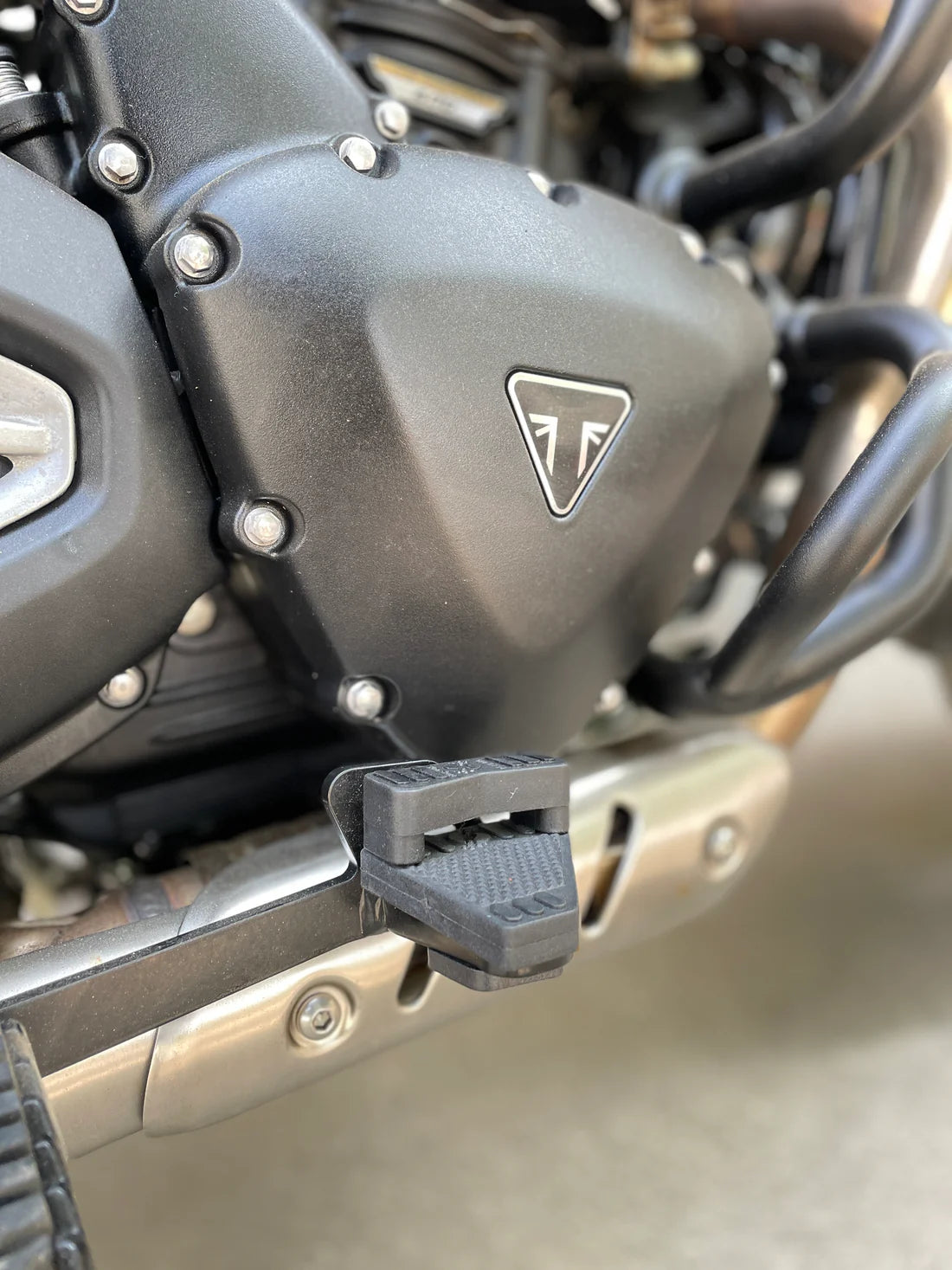 The Easy Brake for the Triumph Scrambler 400 X and has a customized base lock designed to fit into the rear brake pedal of the bike. The base lock acts as a pillar, supporting the comfort base and the Standing Assist