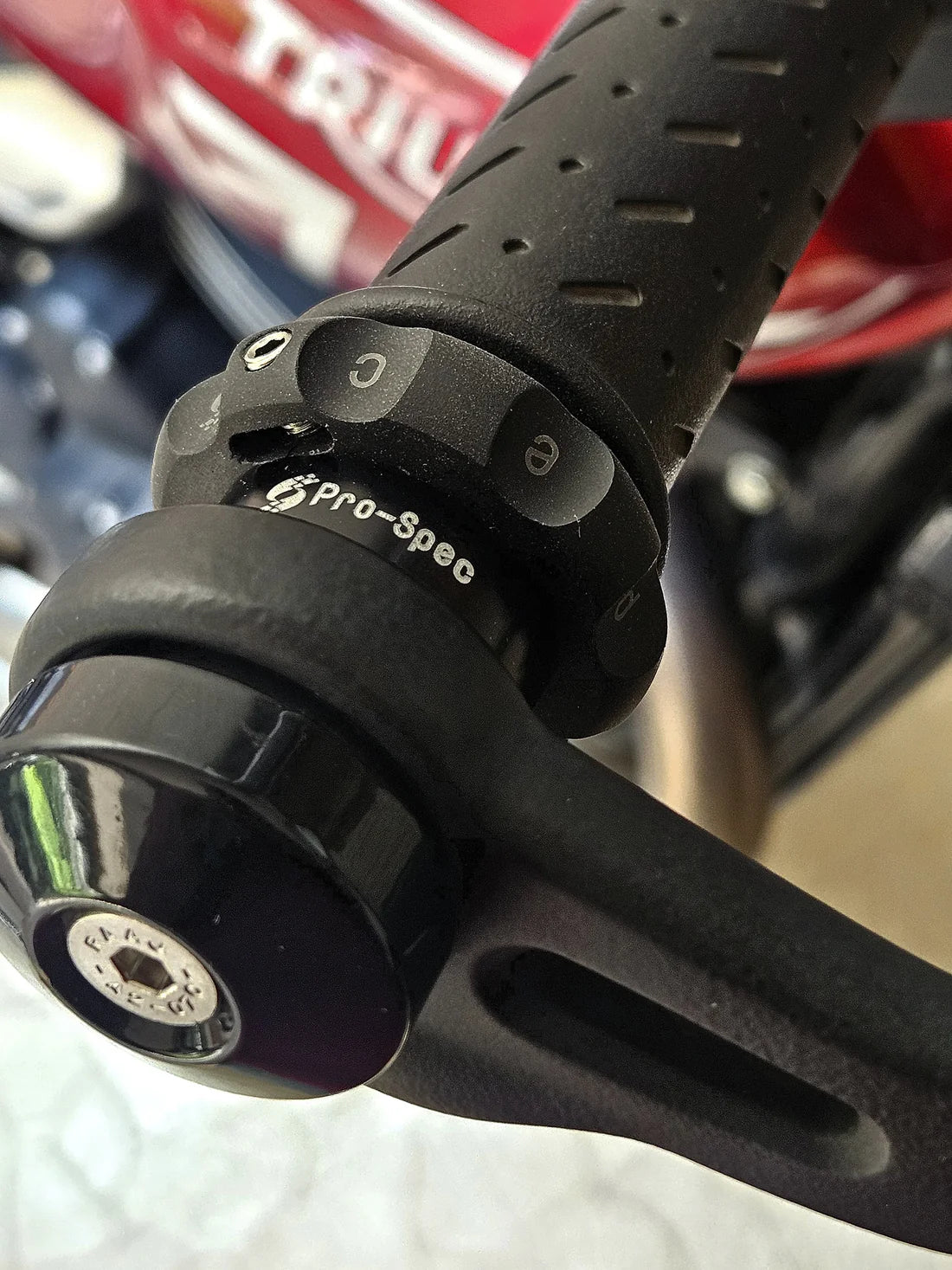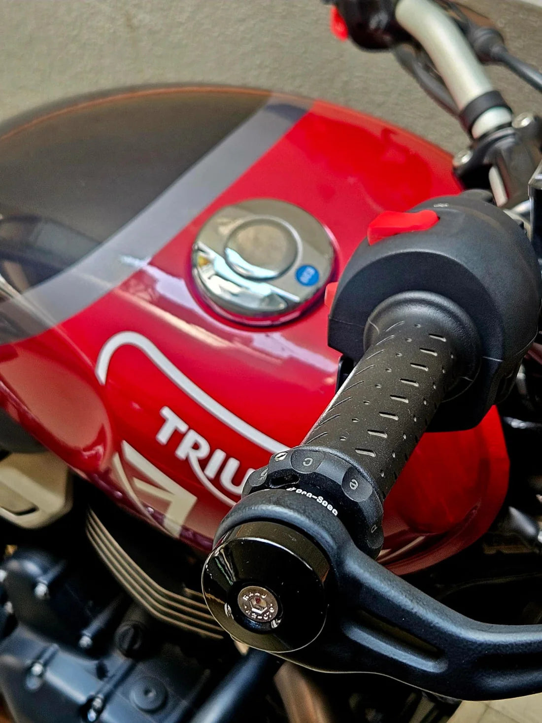 This is a simple mechanical friction throttle control device and is a direct replacement for original equipment weights. The devices are carefully designed to not create any large weight difference between the OE bar end weights and Easy Cruz device. It can be used as cruise mode by turning the knob anti-clockwise or as city mode by turning the knob clockwise. This model is specific for the Triumph Speed 400