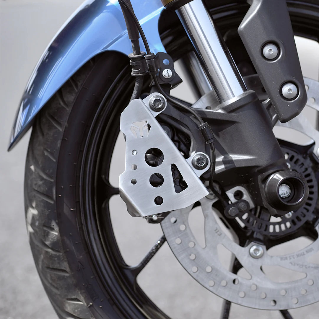 The Moto Torque Caliper Guard (SS) for the Yamaha XSR 155 is a protective cover accessory engineered to safeguard your motorcycle’s brake caliper from road debris, stones, impact and everyday riding hazards. Made with durable stainless-steel construction (SS) and precision-engineered for a bike-specific fit, this guard offers robust protection without compromising brake performance. Its direct bolt-on installation ensures an easy, secure fit using the existing mounting points on your XSR 155, with no major modifications needed. Designed to maintain airflow and cooling around the braking components, the caliper guard helps prolong the life of brake parts and enhances confidence during both urban and spirited rides. Finished in a sleek look that complements the bike’s aesthetic, it’s a practical upgrade for riders who value durability and protection without sacrificing style.