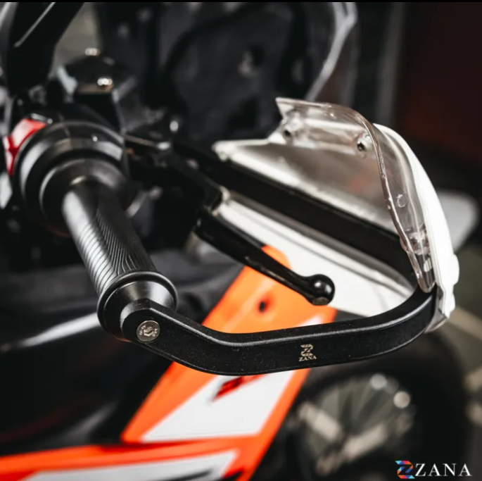 The ZANA Hand Guards are precisely shaped to clear brake/clutch levers and throttle movement, with smart clamp positioning that: