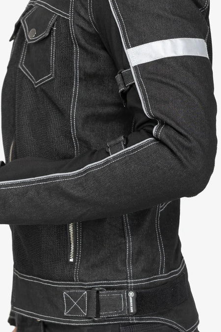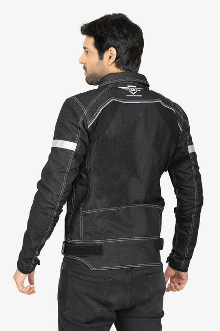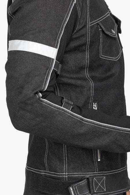 Polyester Cotton Mixed Denim with Lycra Outer Shell This gives a rugged and tough look to the jacket while ensuring safety