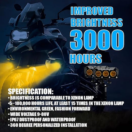 - Dual Mode Lighting: Switch between yellow and white light to improve visibility in different weather conditions, such as fog, rain, or darkness.