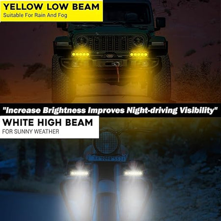 - Dual Mode Lighting: Easily switch between yellow and white light to optimize visibility in different weather conditions, such as fog, rain, or low-light environments.