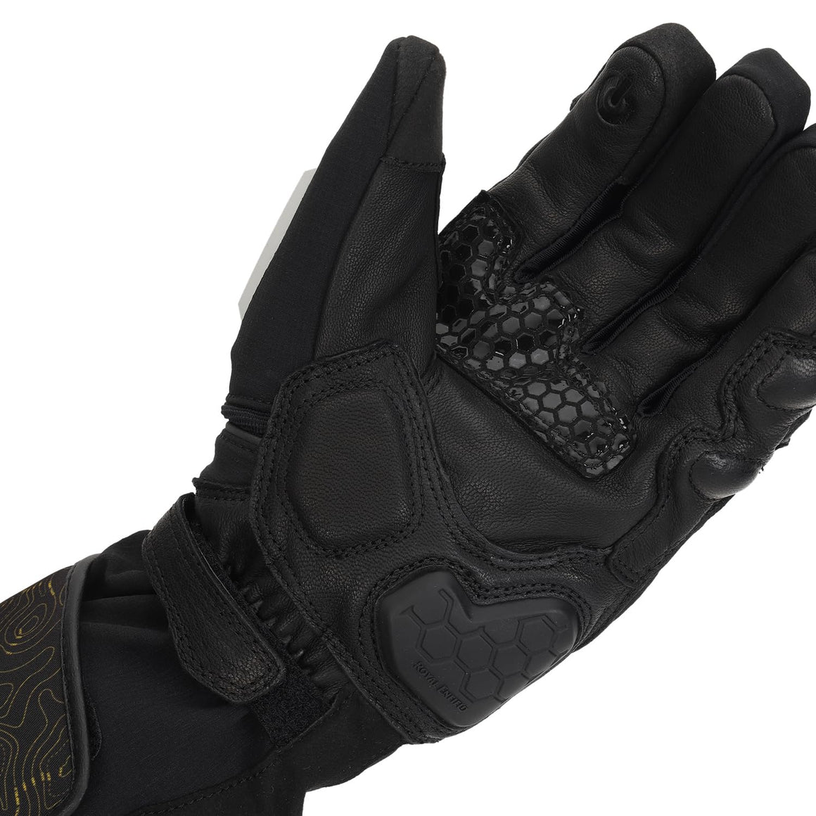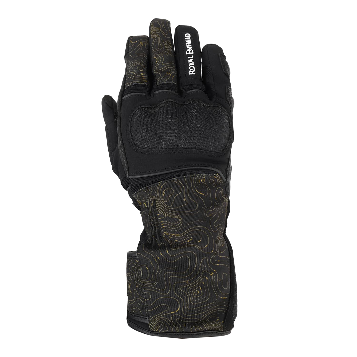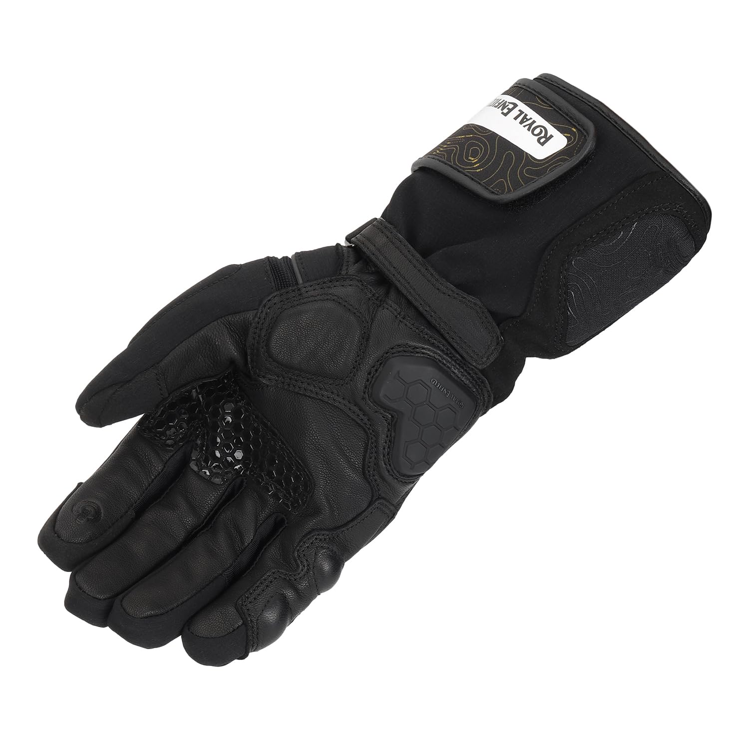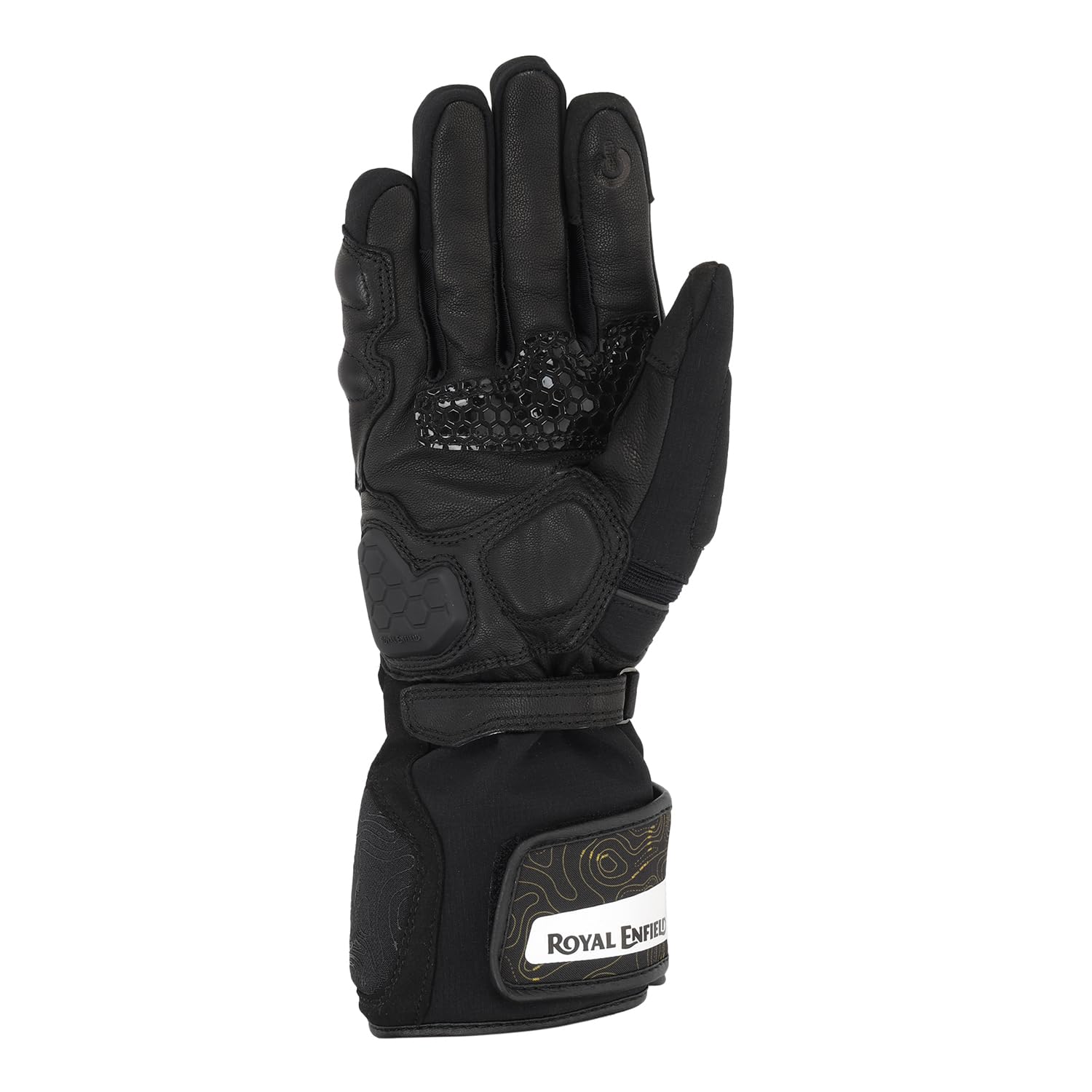 ROYAL ENFIELD NAVIGATOR WATERPROOF GLOVES BLACK Gear up for any ride with Royal Enfield's HydroGrip gloves. Featuring a durable Softshell textile and leather outer, 100% polyester inner, Level 1 KP protection, double wrist closures, and complete waterproofing.