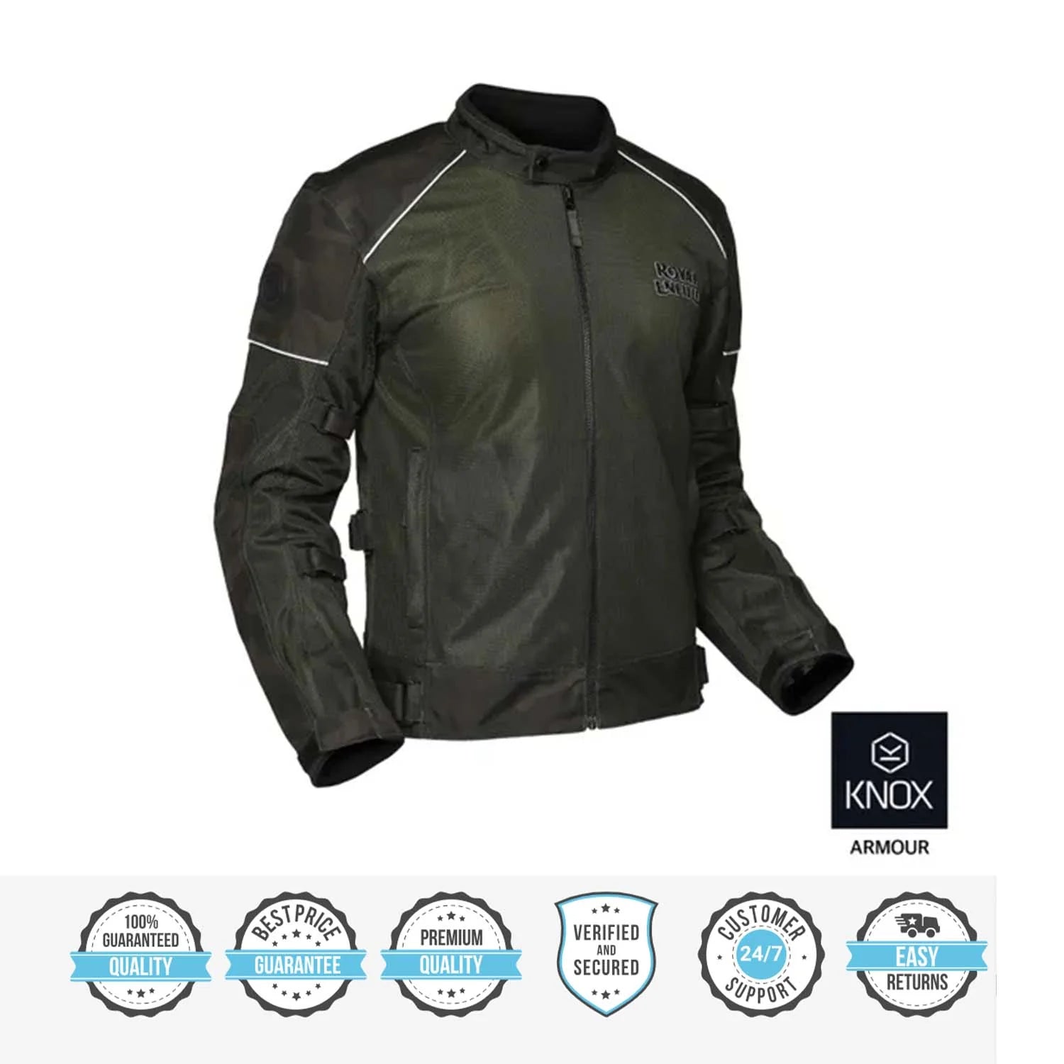Construction: 90% high abrasion-resistant polyester mesh, 10% 600D polyester Fit: Regular, with adjustment tabs on cuffs, waist, biceps, and forearms Abrasion resistance: Premium mesh with high air permeability Impact protection: Knox flexiform Level 1 armours for shoulders and elbows, perforated EVA foam at the back Comfort: Cushioned comfort collar Ventilation: 90% mesh construction for maximum breathability Pockets: 2 front pockets with zippers Genuine YKK zippers Washing instructions: Remove protective armours before washing, hand wash in warm water with mild laundry detergent, rinse separately, do not wring or iron, dry in shade and away from direct heat. The jacket provides a comfortable fit with reliable protection, making it perfect for summer riding.