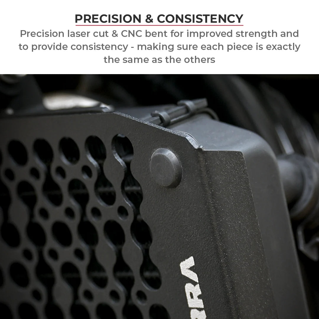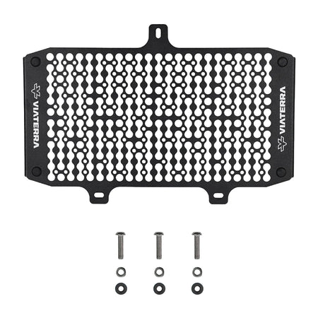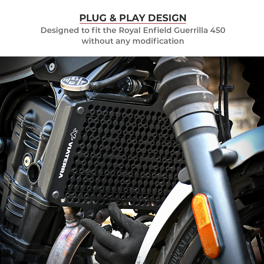 The radiator guard for the Royal Enfield Guerrilla 450 protects the radiator fins from everyday elements such as pressure washing and flying debris during weekend trail rides. It does this without obstructing the airflow, which is essential for engine cooling.