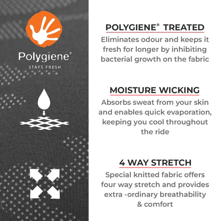 • Anti-odor superpower: Forget t-shirt stink! The fabric is treated with PolygieneTM, used by leading performance & sports wear brands globally, including Adidas. It fights off odor-causing bacteria - even during long and intense rides.